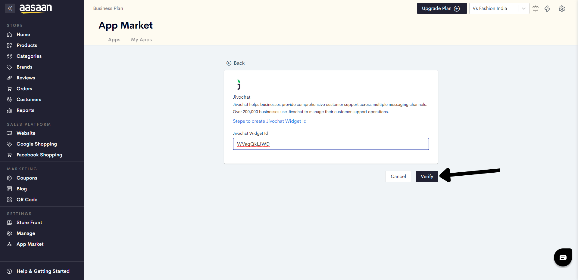 Go to your installed Jivochat app in aasaan. Enter the widget ID and click on Verify.