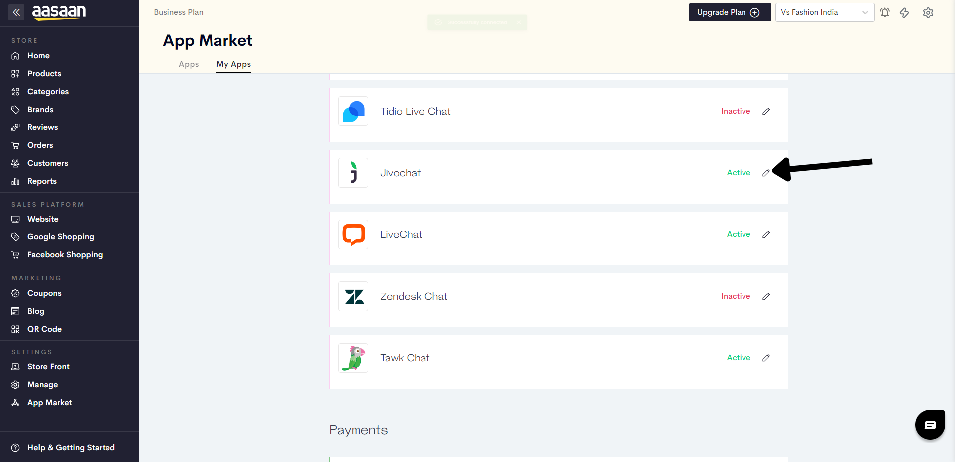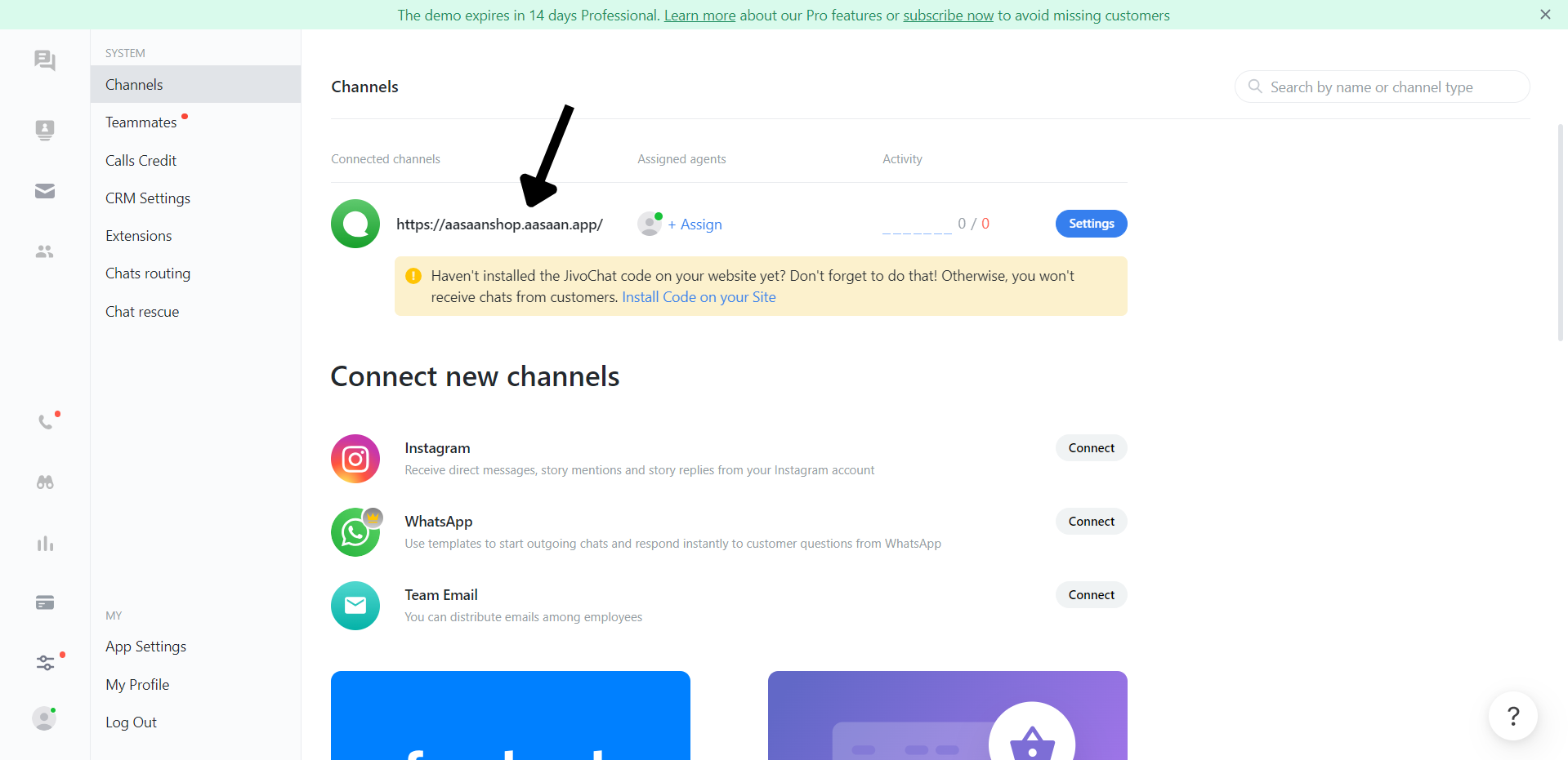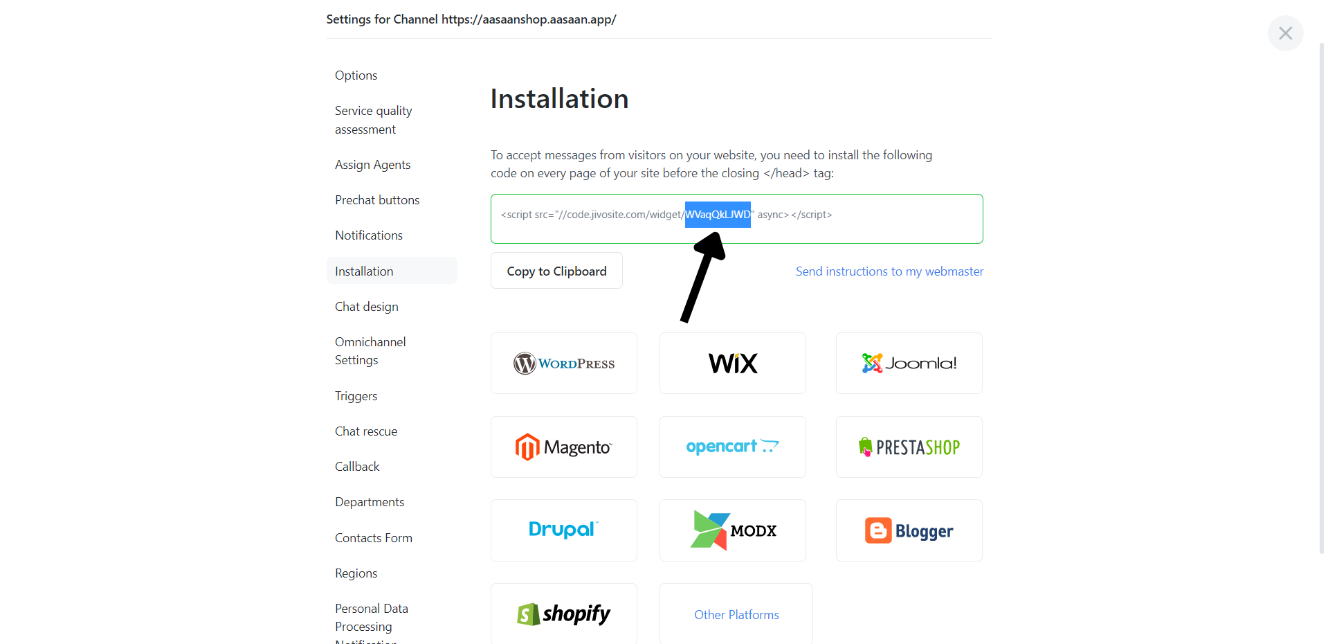 Jivochat is an easy-to-use chat software which you can add on your website for customers to chat with your support team. With aasaan, you can easily set up Jivochat on your store and display your chat button for customers. The steps are as follows: